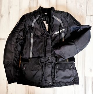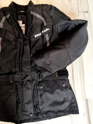 Tallaje grande. tricapa (forro térmico y membrana impermeable Humax, desmontables). Hombros y codos con refuerzos en cuero y protecciones YF nivel 1. Protector de espalda en espuma de alta densidad. Dos bolsillos verticales de ventilación en el frontal con otros dos amplios e impermeables en la parte inferior. Cremalleras de salida de aire posteriores y gran bolsillo lumbar para guadar la membrana o los guantes. Ajustes dobles en brazos y cintura, con elásticos y cremallera con doble apertura en brazos para ventilar. En el cuello, cierre con clip regulable. Solo pequeñas marcas en los reflectantes frontales por uso de chaleco airbag