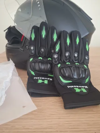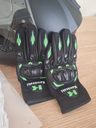 Guantes de moto con diseño deportivo y protecciones. - Color negro con detalles en verde. - Marca Kawasaki. - Protecciones en nudillos y dedos. Talla L.