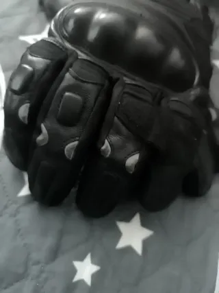 Guantes de moto de cuero y tela. - Diseño en color negro. - Cierre ajustable en la muñeca. - Protecciones en muñecas, nudillos y dedos. -Talla XS Muy poco uso.