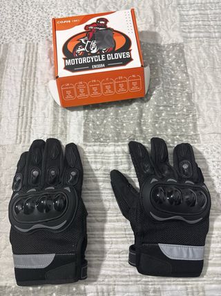Guantes de moto COFIT negros, ideales para el verano. Sin usar. - Material: Poliéster, PVC, Microfibra. - Tejido reflectante. - Cumplen la norma EN13594. Se venden porque fueron un regalo y ya disponía de guantes de cuero.