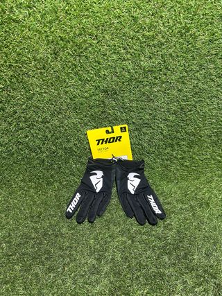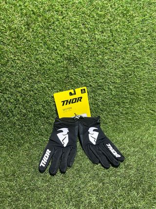 Guantes de cross marca Thor, modelo Sector, talla L. Diseñados para motocross y otras disciplinas off-road. - Color negro con detalles blancos. - Logotipo Thor en blanco en el dorso y puño. - Cierre de velcro ajustable en la muñeca.