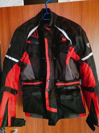 Chaqueta Modeka de cordura talla M con forro interior desmontable y con bastantes bolsillos. Pantalones Compito de cordura talla L ajustable con forro interior desmontable y con varios bolsillos. Se pueden unir ambos. Cómodos y cálidos ambos dos,aguantan bien el agua. Poco uso No sé vende por separado Se regalan dos pares de guantes