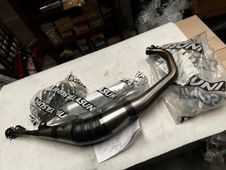 Sistema de escape TJT para motores Minarelli de 2 tiempos refrigerados por aire o agua. - Fabricado en acero inoxidable y aluminio. - Diseño cónico para un mejor rendimiento. - Incluye soportes y tornillería para su montaje.