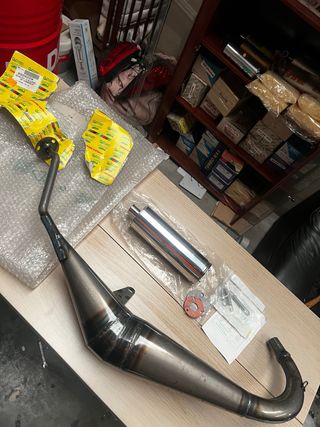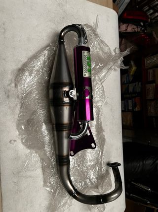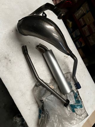 Sistema de escape Turbo Kit para Yamaha DT 50cc. Incluye el colector y la cola. - Fabricado en metal. - Diseño curvo característico. Escape yamaha dt 50, escape krm yamaha, escape most yanaha, escape am6