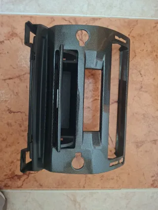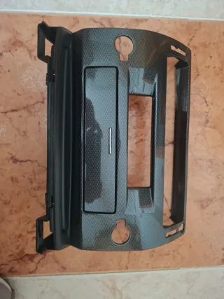 Consola central para Citroen C4 de la primera generación. Presenta un acabado con textura de fibra de carbono. - Diseño con huecos para radio y otros componentes. - Puntos de anclaje y sujeción visibles.