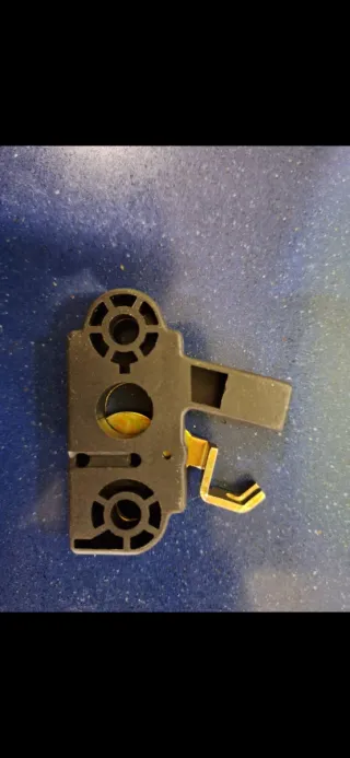 Cerradura para el asiento de una Yamaha Jog RR. Pieza de metal dorado con un componente de plástico negro. - Mecanismo de cierre de asiento. - Compatible con Yamaha Jog RR.