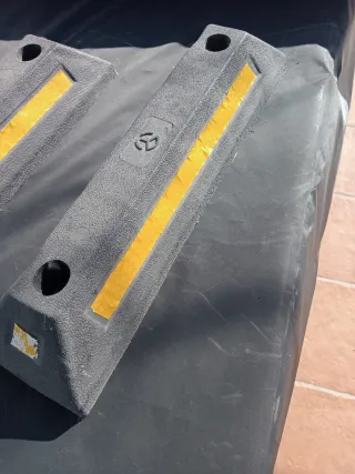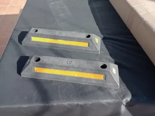 Dos topes de aparcamiento de goma con bandas reflectantes amarillas. - Material: Goma. - Color: Negro. - Bandas reflectantes: Sí. - Cantidad: 2 unidades. - Medidas: 54 x 14 x 10