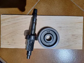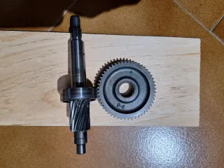 Componente de transmisión primaria Mirenelli para motores horizontales. - Pieza metálica con engranajes helicoidales. - Incluye rodamiento. - Rosca en un extremo.