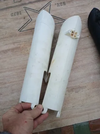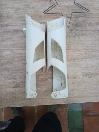 Protectores de horquilla para moto KTM en color blanco. 5 unidades, los de ktm originales estan usados pero en buen estado los otros 3 nuevos una pareja es de los cerrados