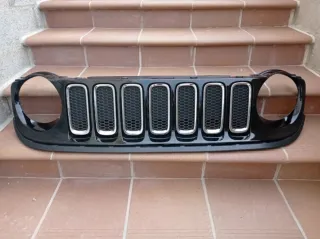Parrilla frontal negra para Jeep usada pero en buen estado. Presenta un diseño con múltiples ranuras verticales y detalles cromados. - Acabado brillante. - Diseño de panal en las ranuras.