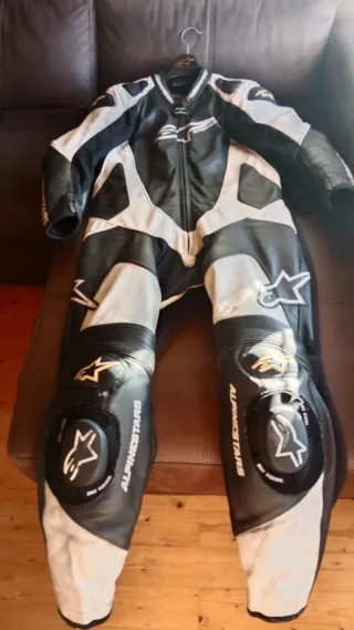 Mono de cuero Alpinestars para moto, en color negro y blanco talla 54 de una pieza. Diseñado para ofrecer protección y guantes poco uso en perfecto estado . Las botas son del 43 y la suela está marcada de los reposapiés de la moto . - Material: Cuero. - Color: Negro y blanco. - Marca: Alpinestars.