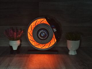 Pieza de decoración inspirada en un freno de disco BMW M con iluminación LED. - Diseño único con logo BMW. - Iluminación LED integrada en color naranja. - Base de soporte incluida. - Interruptor de encendido - Medidas 25cm x 25cm
