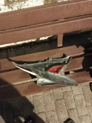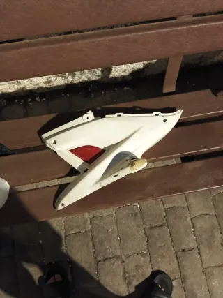 Carenado de plástico blanco para la zona de los pies traseros de una Aerox. Incluye un detalle reflectante rojo. - Pieza de plástico blanco. - Detalle reflectante rojo.