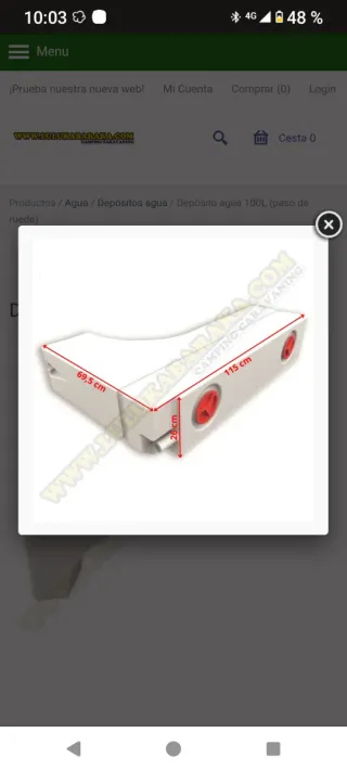 Depósito de agua limpia para camper, con capacidad de 100 litros. Lo compré hace 2 semanas por 120 euros más gastos de envío con lo que menos de 100no puedo dejarlo - Modelo: Depósito agua 100L (paso de rueda). - Referencia: DA100L. - Color: Blanco con tapas rojas.