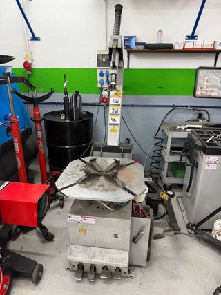 Máquina desmontadora de neumáticos para taller. - Plato giratorio con garras. - Panel de control con pedales. - Brazo de montaje vertical.