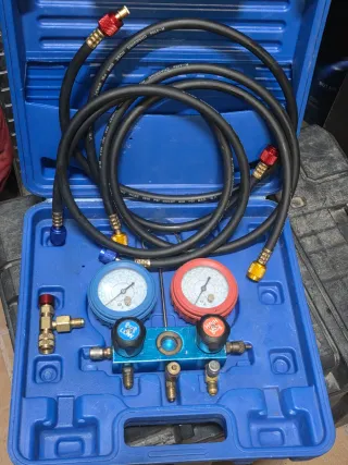 Juego de manómetros para sistemas de climatización, compatible con R-410a. - Incluye mangueras de carga. - Dos manómetros (azul y rojo). - Válvulas de control (LOW y HIGH). - Conexiones de latón.