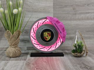 Original lámpara decorativa con diseño de freno de disco Porsche. Iluminación LED en color rosa. - Interruptor para encender y apagar - Conexion USB con cable Incluido - Medidas 30cm alto y 25cm ancho