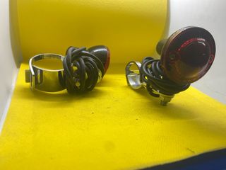 Par de intermitentes para scooter eléctrico. Diseñados para una fácil instalación. - Color: Negro con lente roja. - Incluye abrazadera metálica y cableado.