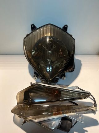 Se vende faro delantero e intermitentes delanteros de Honda Dylan 125/150, están ahumados, no es vinilo, es barniz y pintura, la luz pasa perfectamente, el faro delantero tiene adaptada una bombilla de led con luz larga y corta, están en perfecto estado ambas cosas, con todas sus pestañas y todo bien echo. PRECIO NO NEGOCIABLE. SE HACEN ENVIOS POR WALLAPOP.