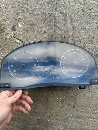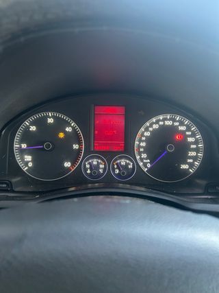 Cuadro de instrumentos para Volkswagen Golf 5. Muestra información relevante para la conducción. - Indicador de revoluciones por minuto (RPM). - Indicador de velocidad (km/h). - Indicador de temperatura del motor. - Indicador de nivel de combustible. - Pantalla digital con información adicional (consumo, distancia, etc.).