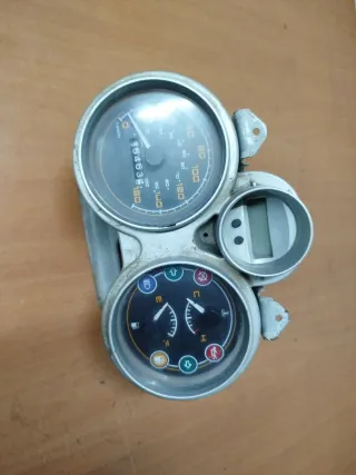 Cuentakilómetros para Piaggio Carnaby del año 2007. Muestra la velocidad y el nivel de combustible. - Indicador de velocidad hasta 160 km/h. - Indicador de nivel de combustible. - Pantalla digital para información adicional. - Incluye testigos luminosos (luces, intermitentes, etc.).