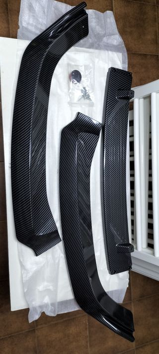 se venden piezas imitación fibra de carbono se componen de añadido faldon delantero completo de tres partes, dos piezas para el parachoque trasero para las esquinas, dos piezas para la luna trasera para los costados y las luces de intermitencia para los retrovisores todo nuevo sin usar. las fotos van en el orden en que se an descrito las piezas.