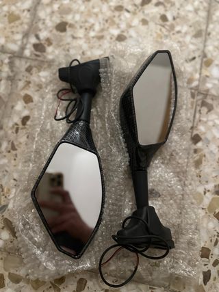 Par de espejos universales para moto, nuevos y sin usar. Diseñados con un acabado que imita la fibra de carbono. - Diseño deportivo y moderno. - Incluyen luces intermitentes integradas. - Compatibles con la mayoría de modelos de moto.