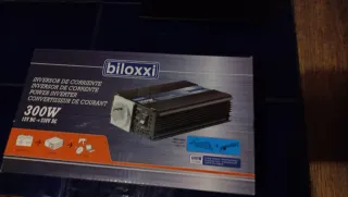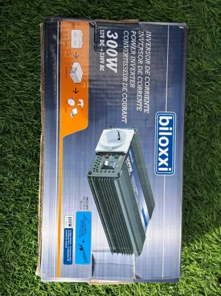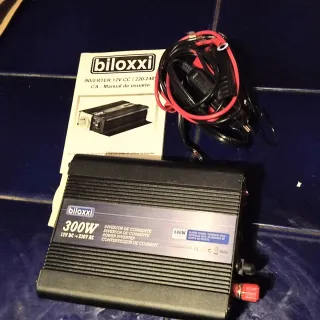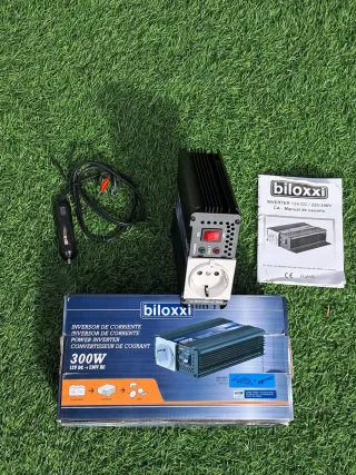 Inversor de corriente Biloxxi de 300W, ideal para convertir 12V DC a 230V AC. - Potencia nominal de 300W. - Potencia de pico (surge power) de 600W. - Incluye cables de conexión.