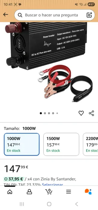 Inversor de corriente de 1000W para coche, con salida de onda sinusoidal pura. - Potencia de salida: 1000W. - Forma de onda de salida: Onda sinusoidal pura. - Voltaje de entrada: DC 12V (9.5V-15V). - Voltaje de salida: AC 220V (210V-240V). - Puerto USB: 3.1A.(IMPORTANTE TIENE LA TOMA DE MECHERO UN POCO ROTA COMO SE VE EN LA ÚLTIMA FOTO NADA QUE NO IMPIDE EL FUNCIONAMIENTO CORRECTAMENTE)