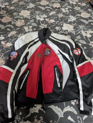 Chaqueta de cordura para moto con diseño deportivo. - Combinación de colores negro, blanco y rojo. - Parches decorativos en mangas y pecho. - Cremalleras en bolsillos frontales.