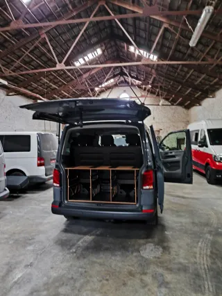 Kit camper para Volkswagen caravelle T6 hecho de material de alta calidad, de contrachapado de abedul finlandés con encolado fenólico de 12mm de espesor. Es un material muy resistente, flexible y duradero, modulo fácil de montar y desmontar. Va con sus contenedores Eurobox. Práctico y robusto. Tiene dos y medio y sigue como el primer día, se vende por cambio de proyecto. No hace falta homologación.