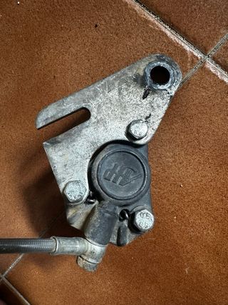 Kit de freno trasero para moto de campo. Incluye pinza con pastillas a medio uso,soporte de pinza, bomba de freno hidráulico, deposito de liquido de freno