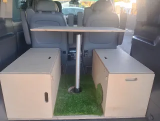 Kit de camperización hecho a medida para furgonetas o coches. Ideal para adaptar el vehículo a tus viajes. Precios desde 450 euros. El modelo de la foto es de contrachapado crudo, barnizado, con vinilo impermeable, con tres posiciones (cama, mesa y sofá), un baúl y un cajón corredero para cocina. Para modelos y personalizaciones, preguntad precios sin problemas. Colchones aparte, también personalizables según necesidad.