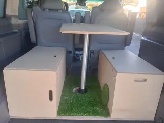 Mueble de camperización para un vehículo tipo monovolumen o furgoneta pequeña,diseñado para maximizar el espacio de almacenamiento y convertirse en cama. El diseño en kit permite su instalación y desinstalación rápida sin necesidad de homologación, ya que se considera carga. Detalles del equipamiento Mueble: Estructura de madera con 2 cajones para utensilios cocina y almacenamiento. Incluye tabla abatible que se extiende para formar parte de la cama. En los cajones se dispone de 2 tablas correderas para usar como mesas. Medidas: Cama: 1.80 x 100 Módulo plegado: Ancho 70 Largo 63 Alto 31 Mesitas: 54.5 x 41 cada una