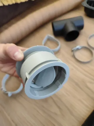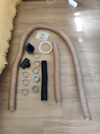 Kit calefacción. Sobrantes de la instalación que hice en mi furgoneta, a estrenar: - Tubo flexible calefacción, díametro 60cm interior, 65 exterior. Tirada larga de 2'60 metros. Otra tirada de 70cm y otra tirada de color negro de 44cm. - Tubo para gasoil (blanco rígido, 4 metros) - Salida de aire con rejilla, negro, 11*11cm*7cm alto. - Salida de aire con tapa móvil, gris, truma, 8cm. - Codo, tres aperturas. 12'5cm*9'5cm. - Abrazaderas metálicas. - Anillos de sujeción. - Placa de montaje. Chapa de 17*14 cm. Diámetro de círculos grandes interiores 3cm.