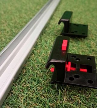 Kit de herrajes para mesa plegable, ideal para campers y furgonetas. - Dos perfiles metálicos. - Soportes de plástico gris.