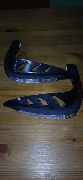 Protectores de puños para moto con luces LED integradas. Diseñados para mejorar la visibilidad y proteger tus manos. - Color negro. - Diseño aerodinámico con ranuras. - Luces LED de señalización.