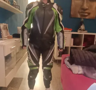 Mono de cuero de dos piezas de la marca Ixs. - Diseño en negro, verde y plateado. - Cremallera frontal.150 el mono solo. Posibilidad de los guantes y de las botas pero eso es un precio aparte