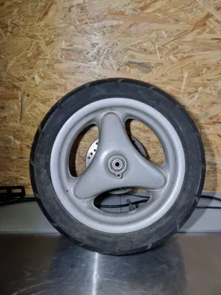 Rueda delantera para Piaggio Zip de 10 pulgadas, incluye disco de freno en buen estado. El neumatico esta cuarteado.