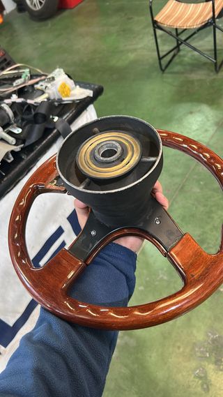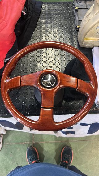 Volante de madera para Mercedes-Benz con el logo de la marca en el centro. - Diseño clásico y elegante. - Acabado en madera pulida. - Insignia Mercedes-Benz.
