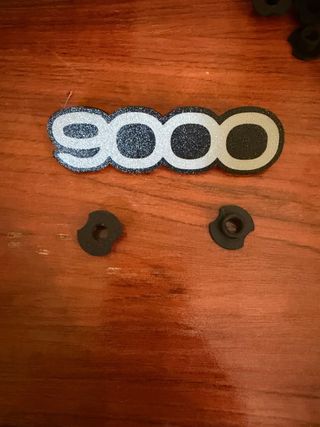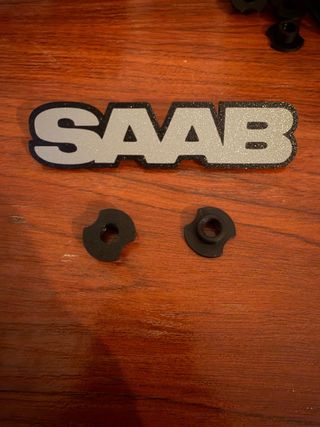 Logotipo de la marca Saab, modelo 9000, diseñado para alfombrillas. Fabricado en 3D, posibilidad de personalizar los textos, colores y dimensiones. - Diseño con acabado brillante y detalles en negro. - Incluye dos piezas de sujeción negras.