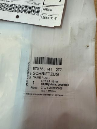 Emblema trasero plateado para Audi A5. - Número de pieza: 8T08537412ZZ. - Diseño metálico.