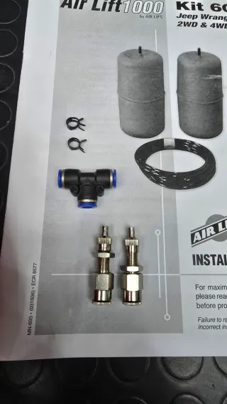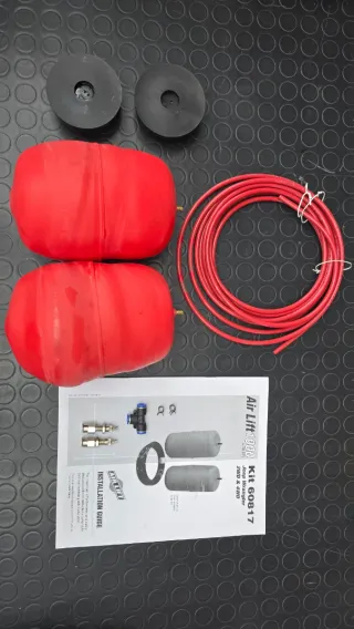 Kit Load Lifter Airlift 1000 para Jeep Wrangler 2WD y 4WD. Incluye todos los componentes necesarios para su instalación. Se trata de un kit de balonas que se instalan en el interior de los muelles del eje trasero para poder nivelar el vehículo estando cargado o con remolque. - Dos bolsas de aire rojas. - Manguera de aire roja. - Dos soportes de goma negros. - Guía de instalación.