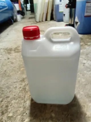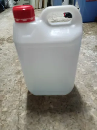 Se venden varias garrafas de plástico vacías de 5 litros cada una. Son ideales para almacenar o transportar líquidos. - Capacidad: 5 litros. - Material: Plástico resistente. - Color: Blanco translúcido. - Tapón: Rojo.
