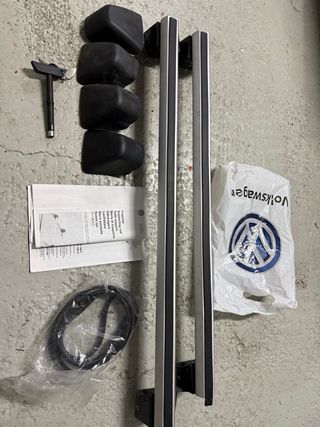 Juego de barras de techo para Volkswagen Tiguan del año 2012. Incluye los soportes y accesorios necesarios para su instalación. - Barras de aluminio. - Soportes de goma. - Herramienta de montaje. - Instrucciones. - Llave -Material original