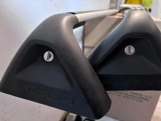 Barras de techo para coche de la marca Peugeot. Diseñadas para un ajuste seguro y elegante. - Acabado en negro mate. - Logo de Peugeot grabado. - Incluye cerradura de seguridad.