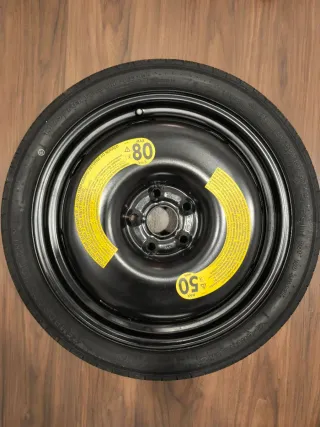 Rueda de repuesto temporal de Seat León 2024. - Medida: T125/70R18 99M-T010. Distancia entre tornillos 6,5cm. 5 agujeros. - Velocidad máxima: 80 km/h. - Velocidad máxima: 50 mph.