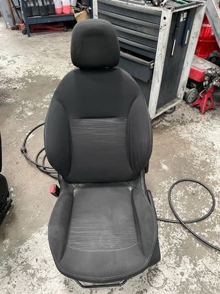 Asientos delanteros de Peugeot 208. - Tapicería de tela negra. - Reposacabezas integrado. - Costuras blancas. - Incluye cinturón de seguridad.