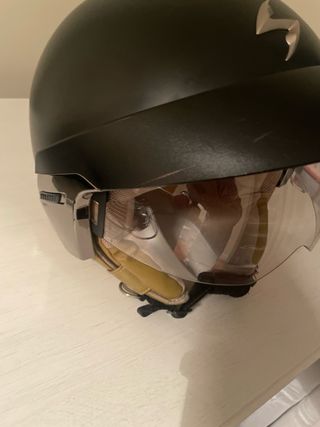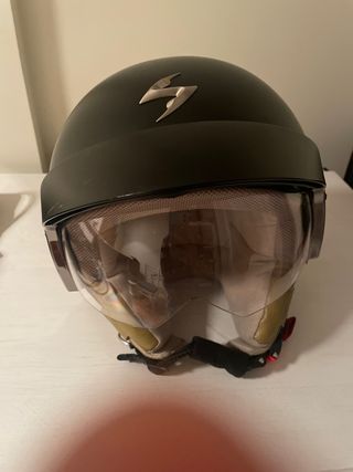 Casco jet de la marca Scorpion Exo. - Diseño abierto tipo jet. - Visera transparente. - Logo Scorpion en la parte superior. Tiene rota la carcasa de dentro como se ve en la foto, se ha rajado pero se puede pegar. La visera se queda bajada pero regalo instrucciones y visera oscura con unas piezas con las que igual alguien mañoso lo puede arreglar.