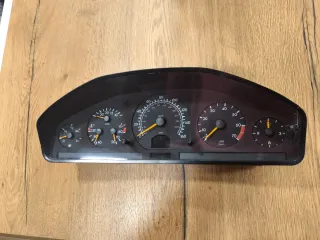 Cuadro de instrumentos para Mercedes SL 500 modelo R129 del año 1999 (versión en millas); la electrónica y relojes están en perfecto estado; el Cluster en la esquina tiene pequeño roto el metacrilato. Se vende para repuestos. Un saludo - Indicador de velocidad (mph). - Indicador de revoluciones (x100 1/min). - Indicador de temperatura del refrigerante (°C). - Indicador de nivel de combustible. - Indicador de consumo de combustible (MPG).